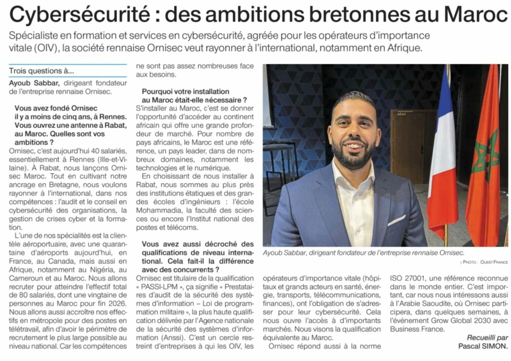 ORNISEC, cabinet de conseil et d’audit en cybersécurité basé à Rennes, continue de renforcer son influence internationale. L’entreprise bretonne, certifiée PASSI-LPM et reconnue pour son expertise en audit de sécurité informatique, fait la une du Journal des Entreprises pour l’ouverture de son antenne à Rabat. Une nouvelle étape stratégique qui confirme sa position de leader de la cybersécurité en Bretagne, en France et désormais en Afrique.